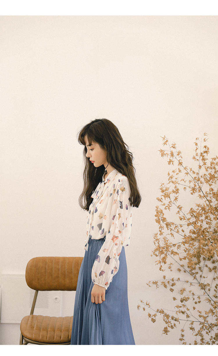 ふんわりとした生地と透け感が大人っぽく女性らしい雰囲気の、長袖シフォンシャツです。