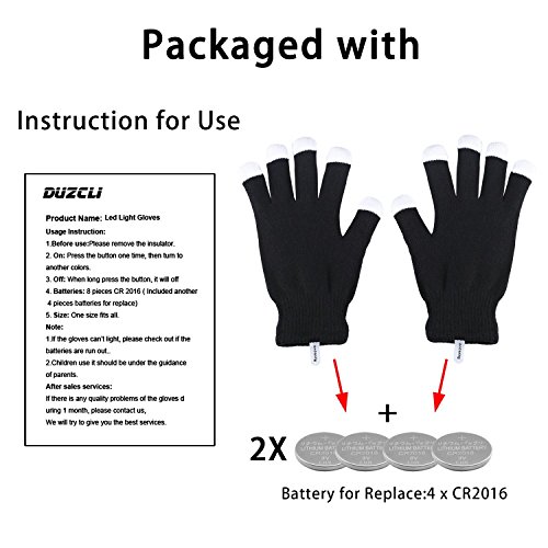 DUZCLI Led Flashing Light Up Gloves - Kids and Adult Size - Extra Batteries