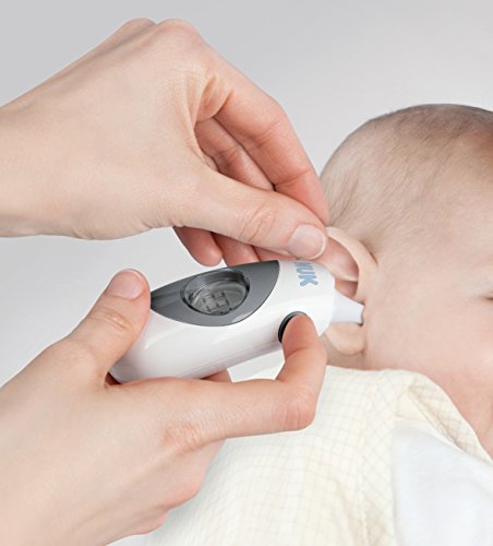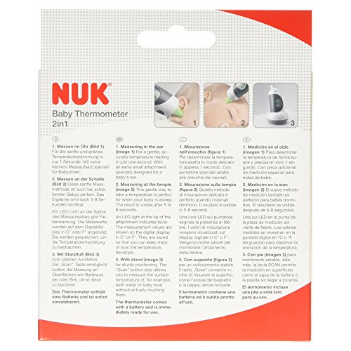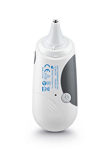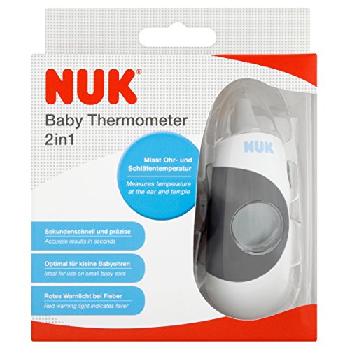 -. Binding : Babyartikel -. Brand : NUK -. Color : weiß/grau -. EAN : 0798256325618 -. Feature : 2 Messmethoden: Fiebermessen im Ohr oder an der Schläfe / Schnelles Ergebnis in wenigen Sekunden durch innovativen, extra kleinen Messaufsatz / LCD-Display für die Anzeige des Messwertes / LED Licht signalisiert Normal- oder Fiebertemperatur mit grünem oder rotem Leuchten / Vielseitig einsetzbar: Auch zur berührungsfreien Messung von Oberflächen wie Babynahrung oder Badewasser, Messung der Raumtemperatur (inkl. Standfuß zum stabilen Aufstellen) -. IsAdultProduct : 0 -. Label : NUK -. LegalDisclaimer : Da Privatverkauf keine Garantie, keine Mängelhaftung und keine Rücknahme. -. Manufacturer : NUK -. Model : 10256345 -. MPN : 10256345 -. PackageQuantity : 1 -. PartNumber : 10256345 -. ProductGroup : Baby -. ProductTypeName : BABY_PRODUCT -. Publisher : NUK -. ReleaseDate : 2013-11-07 -. Studio : NUK -. Title : NUK Baby Thermometer 2in1, extra kleiner Messaufsatz -. UPC : 798256325618