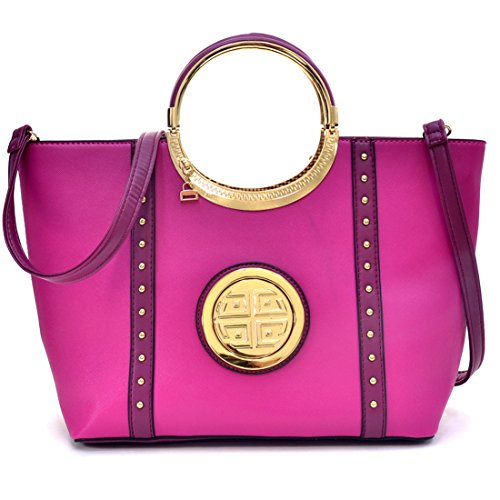 -. Brand : Dasein -. Department : womens -. Feature : Beautiful saffiano vegan faux leather. Goldtone hardware/Metal emblem and petite studs design / Rear zip pockets are great for keys or cell phone / Zip top closure opens wide for easy access with interior zipper and open top item pockets to stay organized / Shoulder Strap easily comes off and it converts to a tote bag. Dual top ring handles with faux leather and decorative zipper for comfortable carry in style / This structured satchel handbag measures 15.5"W x 10"H x 5"D with 5" handle drop and 45" houlder strap length. Dust bag included -. ProductGroup : Shoes -. ProductTypeName : HANDBAG -. Title : Top Handle Shoulder Bag Fashion Studded Satchel Handbag w/ Zip Accent