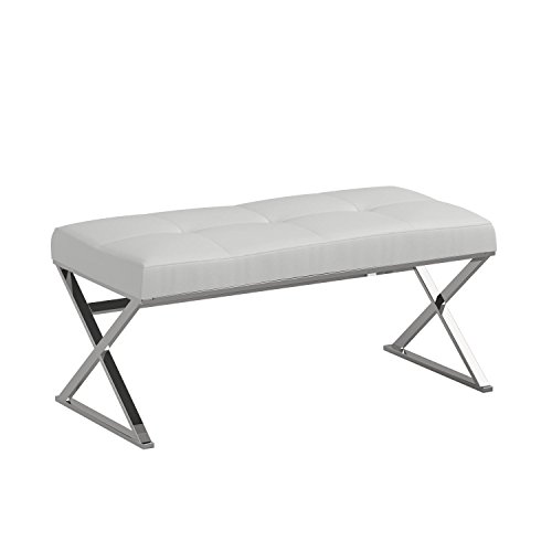 -. Brand : Cortesi Home -. Feature : Dimensions: 39L x 18.5W x 18H in. / White vinyl with square tufted accent / Trestle x-frame in metal with chrome finish / Available in your choice of color / Assembly required -. Label : Cortesi Home -. Manufacturer : Cortesi Home -. MPN : CH-OT168850 -. PackageQuantity : 1 -. PartNumber : CH-OT168850 -. ProductGroup : Furniture -. ProductTypeName : HOME_FURNITURE_AND_DECOR -. Publisher : Cortesi Home -. Studio : Cortesi Home -. Title : Cortesi Home Zio Entryway Bench
