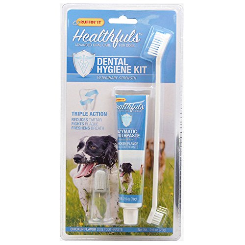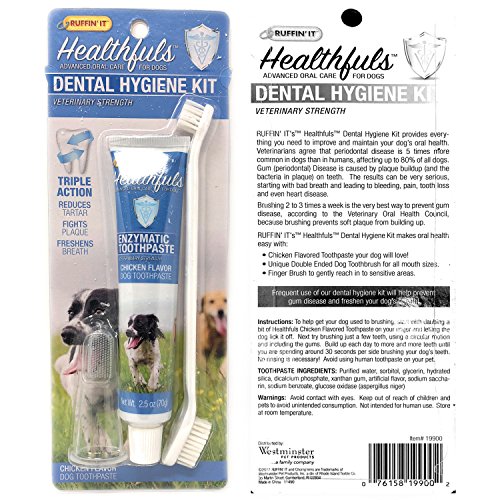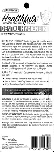 Ruffin' It's Healthfuls Dental Hygiene Kit provides everything you need to improve and maintain your dog's oral health. Veterinarians agree that periodontal disease is more common in dogs than in humans. Brushing 2 to 3 times a week can help prevent gum disease in dogs according to the Veterinary Oral Health Council. Chicken Flavored Toothpaste your dog will love! Unique Double Ended Dog Toothbrush for ll mouth sizes. Finger Brush to gently reach in to sensitive areas. Directions: To help get your dog used to brushing, start dabbing a bit of Healthfuls Chicken Flavored Toothpaste on your finger and letting the dog lick it off. Next, try brushing just a few teeth and some gums. Build up each day to more and more teeth until you are spending around 30 seconds per side brushing. No rinsing is necessary. Avoid using human toothpaste on your pet. Ingredients: purified water, sorbitol, glycerin, hydrated silica, dicalcium phosphate, xantham gum, artificial flavor, sodium saccharin, sodium benzoate, glucose oxidase 9asperigillus niger). WARNING: Avoid contact with eyes. Keep out of reach of children and pets to avoid unintended consumption. Not intended for human use. Store at room temperature. Each Package comes with 1 Unit Enzymatic Toothpaste for Dogs Dental Kit. Pictures may be magnified to show detail. For further information on size, color, conditions please refer to the item description or please ask a question before buying.Feature