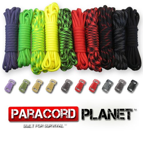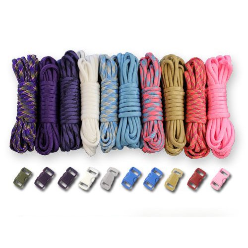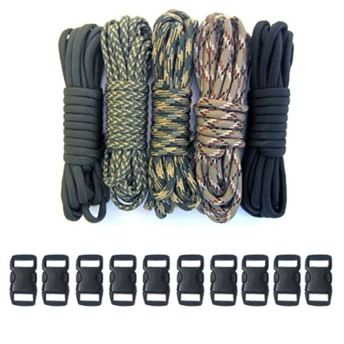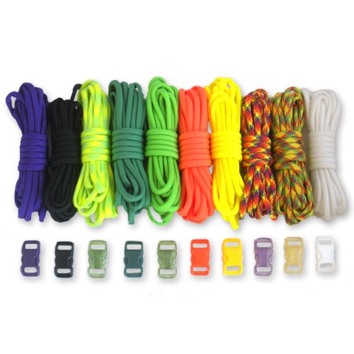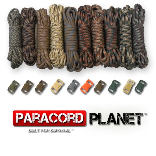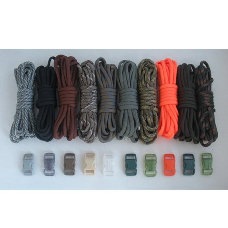 Survival Combo Set that includes 10 feet of the following: ACU Digital Foliage, Black, Desert Camo, Gold, Harmony, Multi Camo, Olive Drab, Tan, Dark Digital and Woodland Camo. This kit also includes 10 buckles.Feature