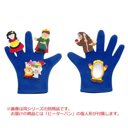 指人形専用のグローブ。面ファスナーが貼り付くようになっています。手にはめて動きをつけながらお話を展開できるから、よりダイナミックに人形劇が楽しめます。青色のグローブと指人形の「ピーターパン」をセットで。