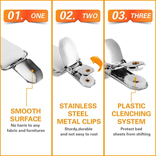 Product DescriptionBed sheet clips keeping sheets place without harming any delicate fabric and non slip off from the corners of your mattress