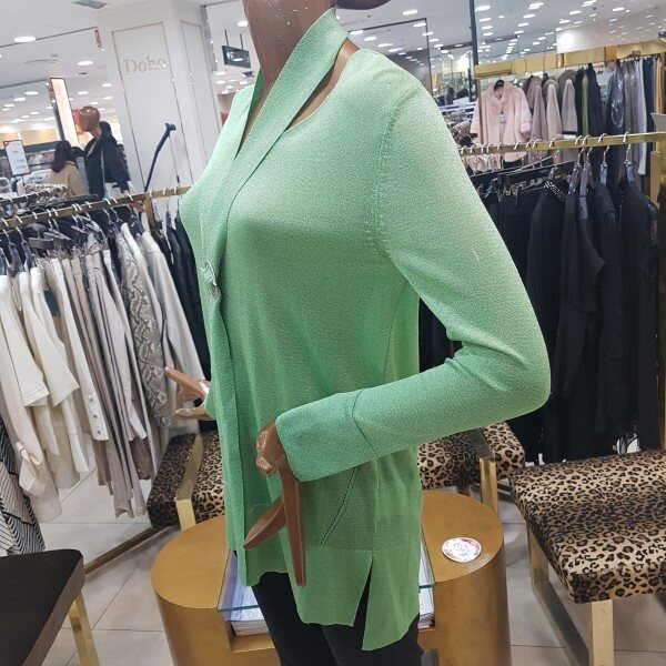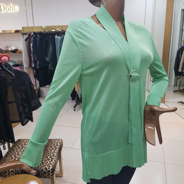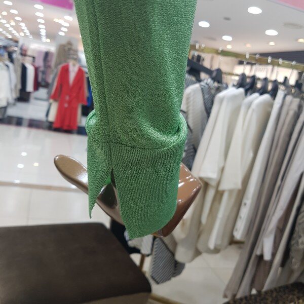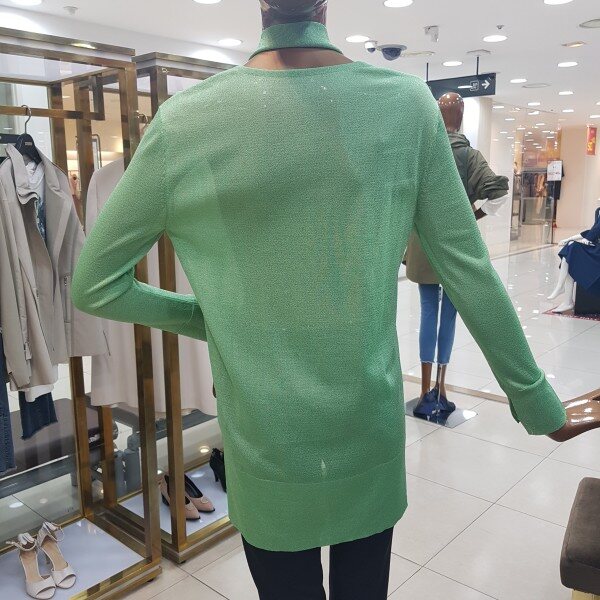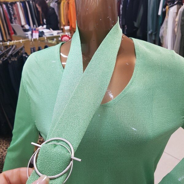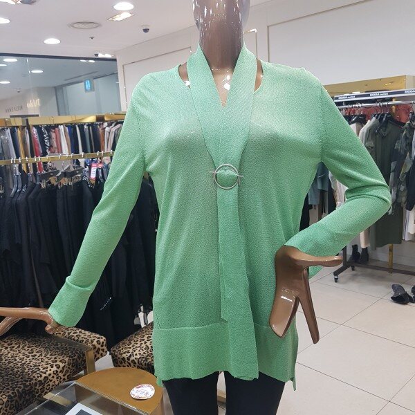 브이넥 목선에 언발한 니트티셔츠로 스카프가 세트인 스타일입니다.