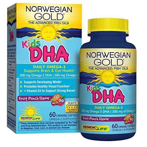 -. Title : Norwegian Gold - Kids DHA - Omega 3 fish oil supplement - fruit punch flavor - brain and bone health - 60 chewable softgels - a Renew Life brand
