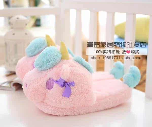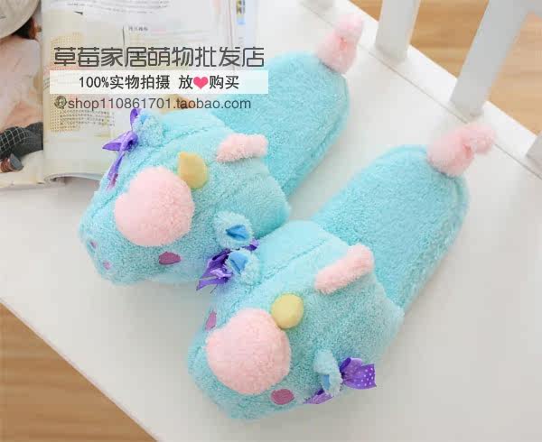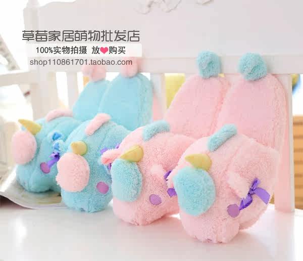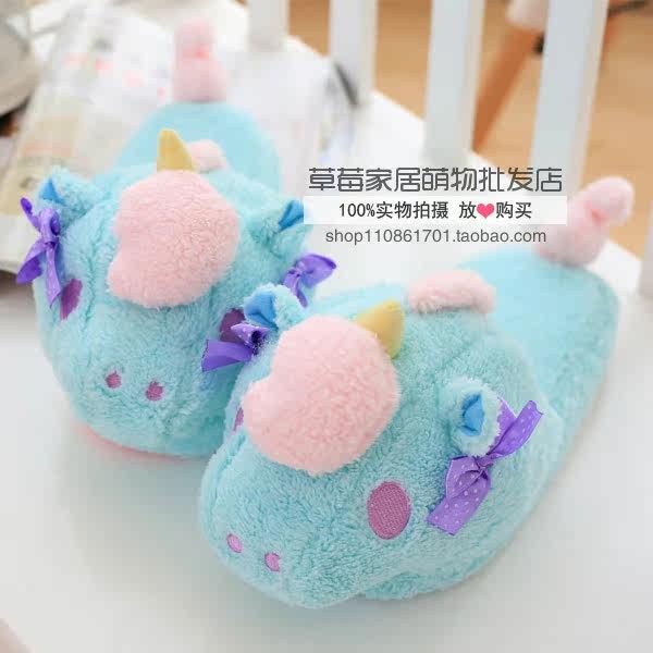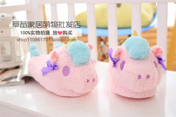 可爱卡通双子星独角兽棉拖鞋秋冬季女家居家保暖厚底室内毛毛拖鞋