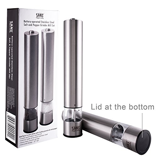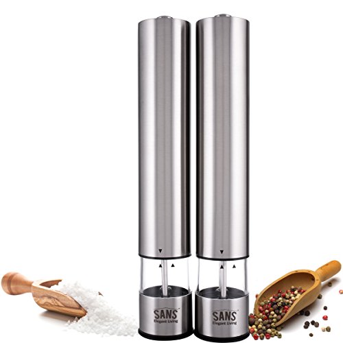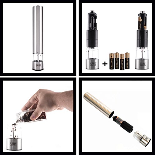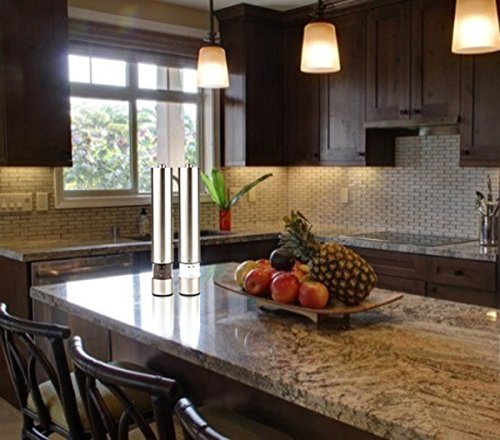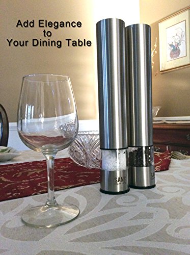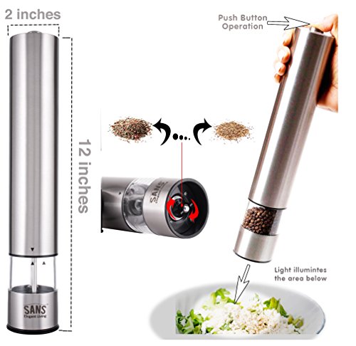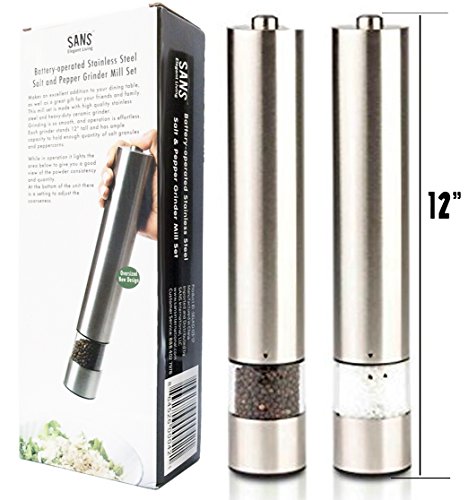 12" Tall Battery Operated Salt and Pepper Grinder Set -- Automatic Push Button Operation | LED Light | Adjustable Coarseness (Pack of 2 Stainless Steel Mills with Caps at the Bottom in a Gift Box)