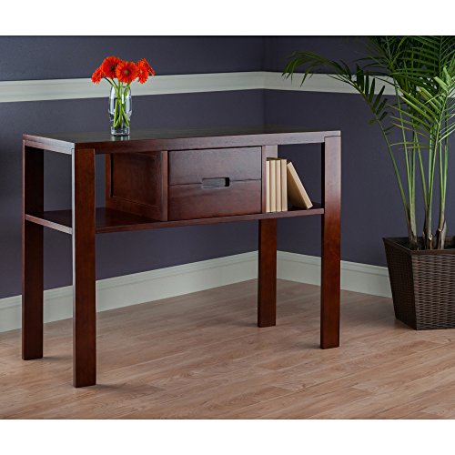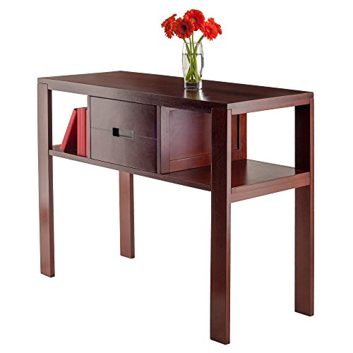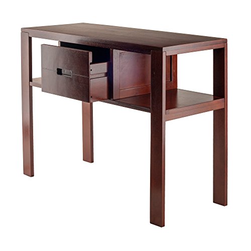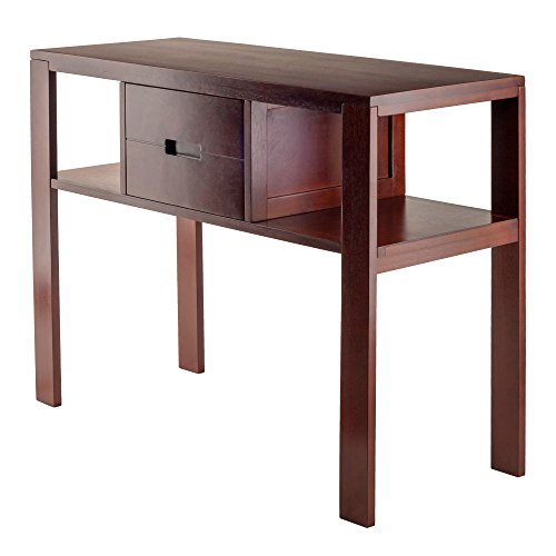 -. Feature : Dimensions: 40W x 15.91D x 29.92H in. / Made of solid and composite wood / Walnut finish / 1 drawer, 2 open shelves / Notched drawer pull