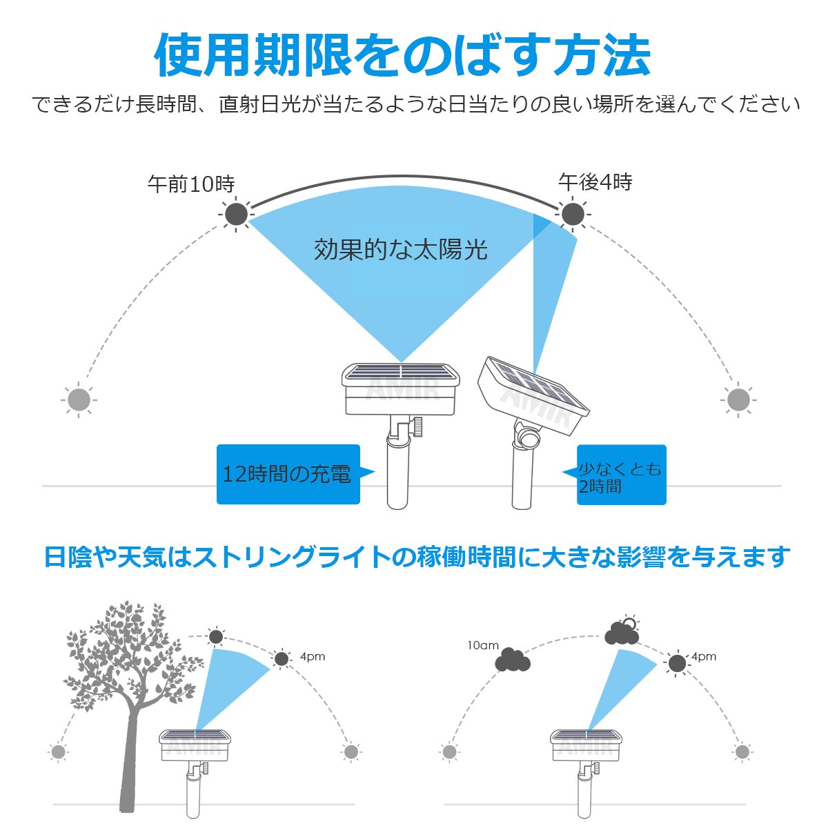 【省エネー&防水】ソーラー式で電気代は一切不要です。電池を交換する必要もありません。日当たりの一番良い場所に設置するだけです。パネルも銅線ライトも防水加工をされており、悪天候でもご心配なくご使用いただけます。屋内・屋外兼用出来ます。ご注意:銅線とLEDライトは防水仕様IP65ですが水に浸るのは禁止です。