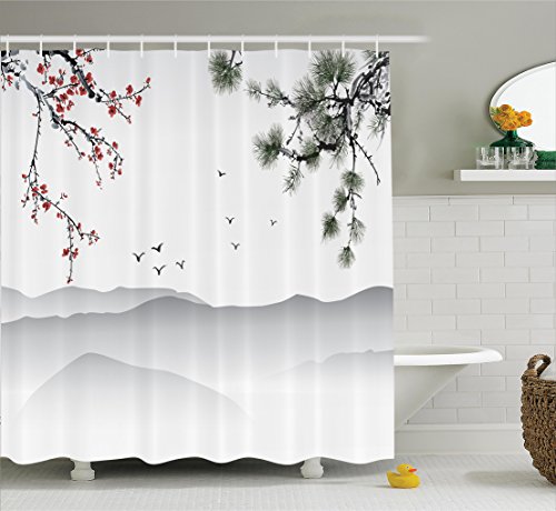 House Decor Shower Curtain Set By Ambesonne, Chinese Painting Style Artwork With Tree Branches Birds Mountains Landscape Art, Bathroom Accessories, 69W X 70L Inches, Red Green Black