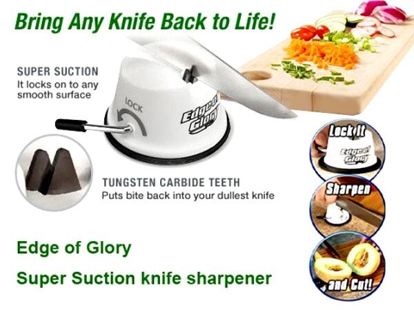 With the Edge of Glory you will bring your dull knives back to life! The secret behind the Edge of Glory are the Tungsten Carbide teeth. These teeth, combined with the powerful suction base, will give perfect results every time! Simply lock it with the suction cup on the base, sharpen, and cut! You will be back to having perfect slices in no time! Using our Edge of Glory Knife Sharpener, no dull knives ruining your perfect cut, no need to replace your costly knife set !