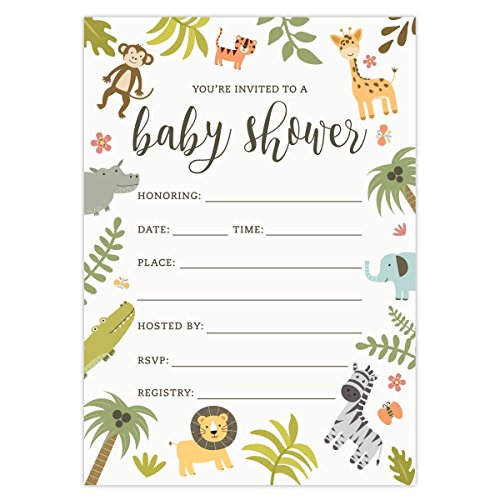 Safari Baby Shower Invitations Set of 25 Fill-In Style Cards and Envelopes. Jungle theme with Monkey, Giraffe, Elephant, Lion and Zebra. Printed on...
