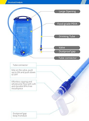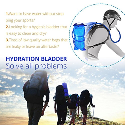 - 2 Liter BPA free bladder which keeps you hydrated. It also keeps the water fairly cool. And include a wide screw cap so you can add ice cubes for an even cooler drink. Enough to get you through a day of hiking, cycling, running or biking.