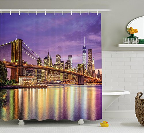 New York Shower Curtain by Ambesonne, NYC Exquisite Skyline Manhattan Broadway Old Neighborhood Tourist Country Print, Fabric Bathroom Decor Set with Hooks, 70 Inches, Purple Gold