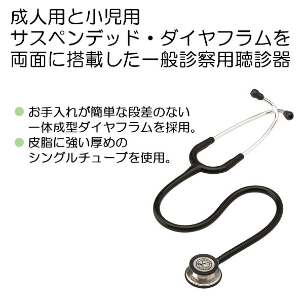 ●成人用と小児用サスペンデッド・ダイヤフラムを両面に搭載した一般診察用聴診器。