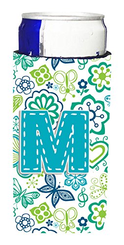 Letter M Flowers and Butterflies Teal Blue Ultra Beverage Insulators for slim cans CJ2006-MMUK
