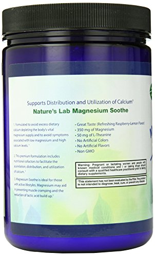 ReleaseDate : 2015-07-09 Studio : Nature's Lab Publisher : Nature's Lab Binding : Health and Beauty Product Description Magnesium sooth is a soothing magnesium drink formulated to help the body balance calcium levels. Formulated to avoid excess dietary calcium depleting the body's vital magnesium supply and to avoid symptoms associated with low magnesium and high calcium levels. This premium formulation includes nutritional cofactors to facilitate the assimilation, distribution, and utilization of calcium. Magnesium soothe is ideal for those with active lifestyles. Magnesium may aid in preventing muscle cramping and the reduction of lactic acid build up. 0