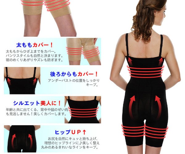 ヒザ上から胸下までをすっぽり覆い、肩ストラップで不快なずり上がり・丸まりを防止するデザインを採用しているから、逃げ場をなくしたお肉はバストへ大移動。キュッとしたくびれボディに!さらに、太もものお肉は内側から整え、ヒップへギュギュッともって行きます。続いて、気になるウエスト・下腹部分は斜めのバンドでパワフルにシェイプ。ポッコリがペッタンコ見せ!アンダーバストの位置だってしっかりキープ!