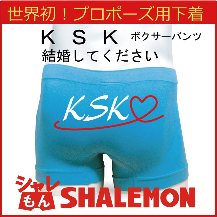 話題のプロポーズKSKをパンツにしました!結婚してくださいって言葉なかなか言えない、照屋さんなキミに履いて欲しいパンツです。このパンツでプロポーズすればきっと、彼女も笑顔でOKしてくれるはず!?もし、しっぱいしたら、「(K)こりゃまた(S)失礼(K)こきました!」って涙をこらえて笑い飛ばしましょう!…あ、逆に、彼女から彼氏にこのパンツをプレゼントして逆プロポーズもあり?かな…??