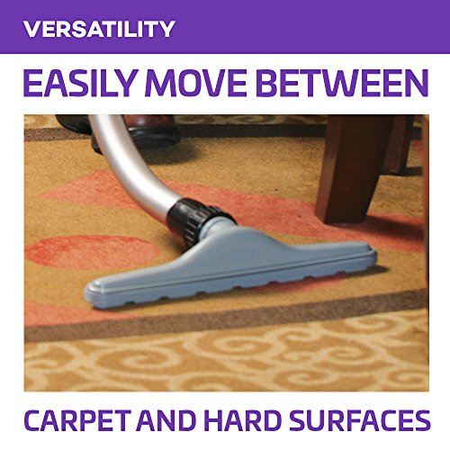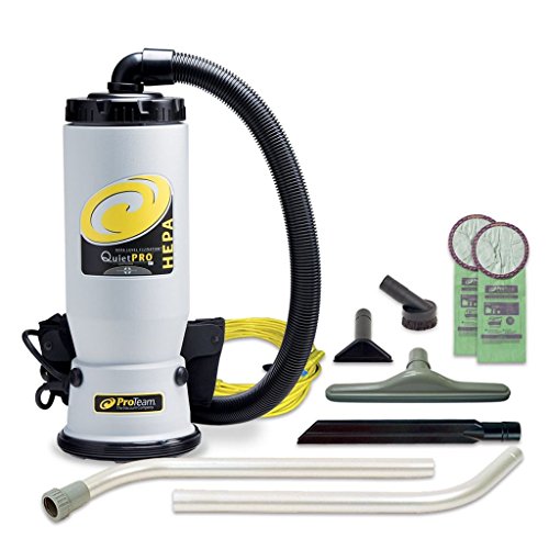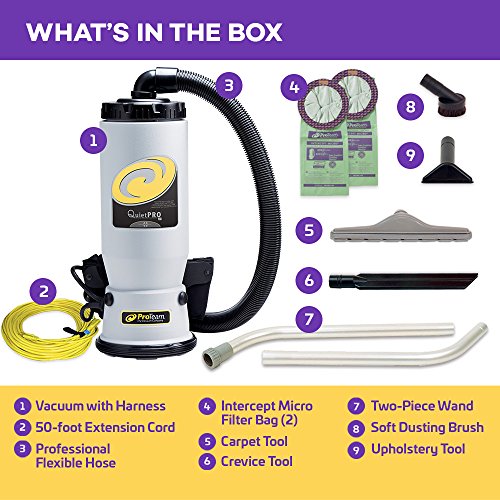 This QuietPro backpack vacuum is loaded with accessories to get the job done including a carpet floor tool, 5-inch upholstery tool, 3-inch dust brush, 11-inch crevice tool, 2-piece aluminum wand, 1-1/2-inch x 54-inch static-dissipating vacuum hose, 50-foot extension cord and 2 Intercept Micro Filter bags.