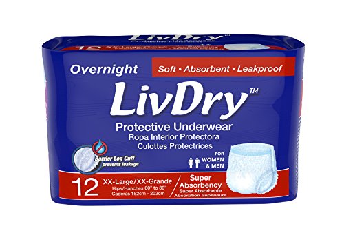 -. Binding : Health and Beauty -. Brand : LivDry -. Feature : Size: Overnight XX-L, Waist/Hip 60"-80" / Quantity: 48 pieces per case (4 bags of 12 pieces) / Barrier Leg Cuffs - Highest protection against leakage / Cloth-like Stretch Panels contours to your body for a comfortable fit / Super Absorbent Gel Core quickly locks fluid away, helps eliminate odors, keeps you feeling dry -. IsAdultProduct : 0 -. Label : Livedo USA Inc -. Manufacturer : Livedo USA Inc -. MPN : LIV048SXXL -. PackageQuantity : 48 -. PartNumber : LIV048SXXL -. ProductGroup : Health and Beauty -. ProductTypeName : HEALTH_PERSONAL_CARE -. Publisher : Livedo USA Inc -. Studio : Livedo USA Inc -. Title : LivDry Protective Underwear Overnight Type Size XX-L; 4 packs of 12 pieces, total 48 pieces