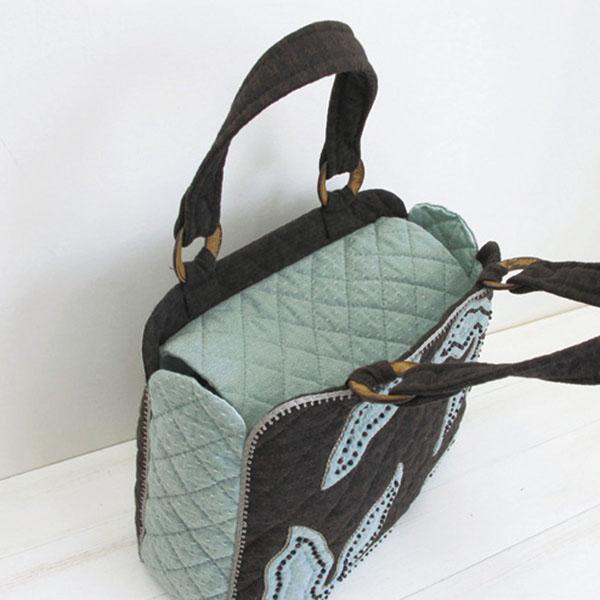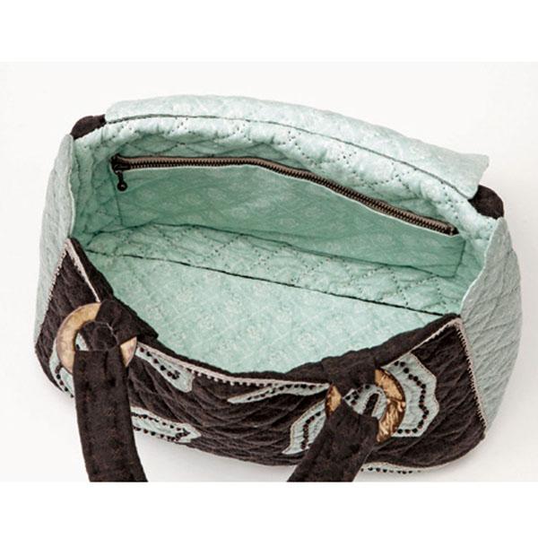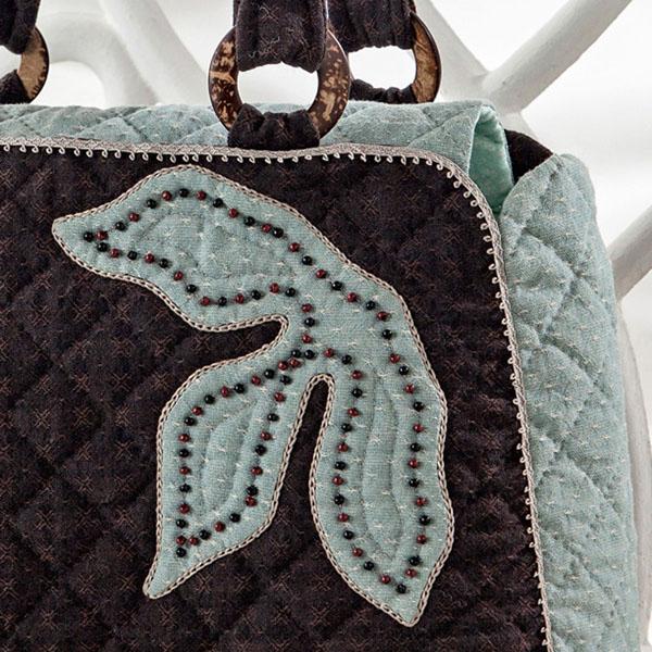 | アップリケの上にはビーズをあしらい、外側にはチェーンステッチを。バッグの周りには、ピコレースで高級感を演出。技術レベルは初~中級者向け。※生地・色・柄等、キット内容は一部変更する場合があります。 |