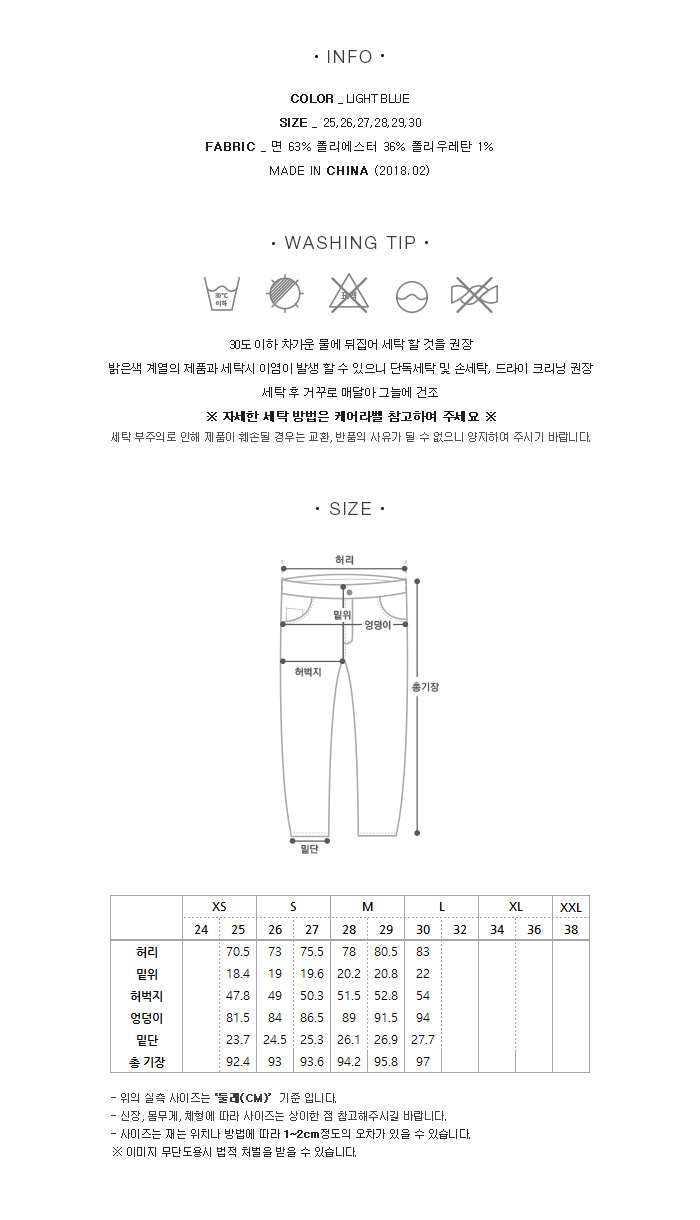 | 되도록 드라이 크리닝 하십시오. 손세탁시 뒤집어 단독세탁 하십시오. 착장시 가방류나 밝은 색상의 의류에 이염 될 수 있으니 주의 하십시오. 반드시 단독 손세탁 또는 드라이 하십시오. 세탁시 탈색의 우려가 있으므로 단독 세탁하십시오. 품질 경영 촉진법에 의한 품질 표시를 꼭 참조하시어 세탁하십시오. 합성세제 세탁시 손상 및 탈색의 우려가 있으므로 미지근한 물에 중성세제로 세탁하십시오. 절대 염소계 표백제로 표백할 수 없습니다. 땀에 젖었을 경우 즉시 세탁하십시오. 심하게 비비거나 비틀어 짜지 마십시오. 물에 10분이상 담가두지 마십시오. 취급부주의로 인한 탈색 및 오염 등 제품의 형태 변질 및 수축된 제품은 보상이 불가능 하오니 주의 하십시요. 취급표시대로 세탁하지 않을시에는 보상받으실수 없습니다. |