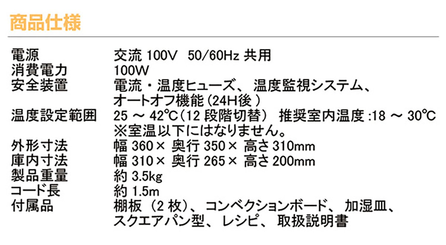 100V 50 / 60Hz common ● Accessories: Humidifier pan 2 shelves board Convection board (lower shelf board) Square pan type (215 × 215 × H50)