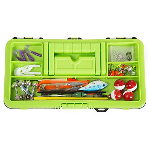 Single Tray tackle box with top access storage compartments, included: 55 pc tackle kit of essential items (counts may vary!)