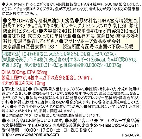 原材料 : DHA含有精製魚油、酵母エキス、イチョウ葉エキス末、ゼラチン、グリセリン、ミツロウ、乳化剤、酸化防止剤(ビタミンE)