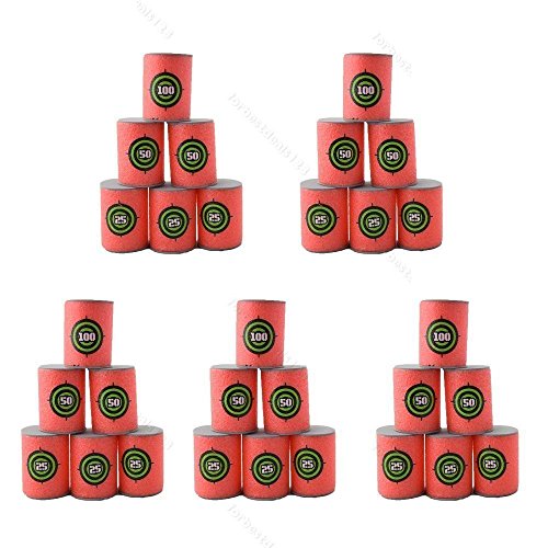 -. Feature : Size: 6.2 x 4.2 cm / Quantity: 30 Pcs / Material: Soft EVA material / Compete with peers or parents to see who can acquire the highest score. / Package Includes: 15 X Bullet target( 25 score),10 X Bullet target( 50 score),5 X Bullet target( 100 score)