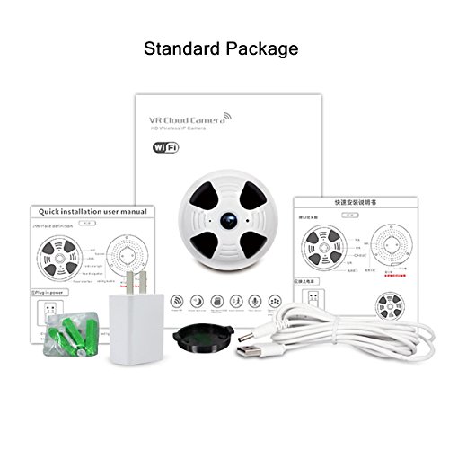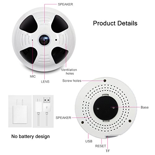 -. Feature : Unique - The first detector camera with 360° panoramic lens. To keep eyes on the whole room with super wide view angle, perfect for your home and office indoor use. Support sd card up to 128 GB. (Not included) / Motion Detection & IR Night Vision - The alert message will be launched to your cell phone if any movement is detected. 4 IR LEDs can see clearly in 32 ft at night. Good for nanny cam, baby monitor and old man care. / Two-way Talk with App Connected to Wi-Fi - Real time transmission makes no distance limit to get in touch with your family, perfect as intercom. 1080P image transmit to your phone at the same time with 2.4G WiFi. (Not for 5G) / No Need to Charge - Tired of charge it day and day? 10 hours is the longest last time for wifi camera, it means you need to charge it frequently. Now this new version without battery is designed for more practical use. / What You Get: 1 x Wifi Security Camera, 1x Power Charger, 1 x USB Cable, 1 x Screw Package, 1 x User Manual, 1 x Wall Fixed Tray. Note: This item without detector function.