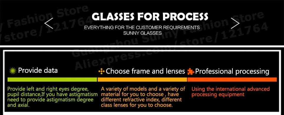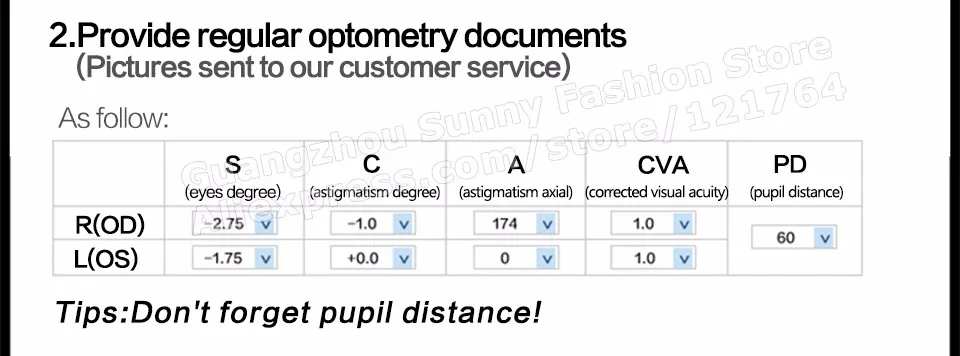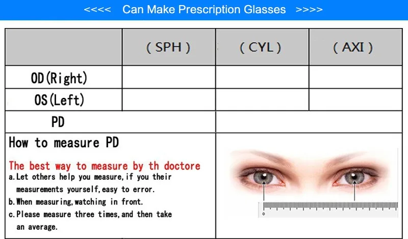 ![]() 참고: 1. 우리에게 메시지를 남겨주세요 처방 정보 또는 의사 종이, 또는 우리는 Falt 안경 의해 기본. 같은: OD (오른쪽 눈): SPH ___; CYL ___; 축 ____. OS (왼쪽 눈): SPH ___; CYL ___; 축 _____. PD (Pupillary 거리) :_____. 당신의 처방 " 추가 ", 한 쌍의 누진. 2. 모든 줄 데이터 정확해야합니다 않고 오류, 당신의 optometrist 말했다 당신이, 참조. 데이터 (참조 데이터). 한번 결정하는 처방 후 변경되지 수. 3. 처방전 난시 2.00, 당신은 개인사용자 정의 렌즈, 문의드립니다, 추가 비용을 지불해야합니다. 4. 당신의 처방 했는데 측정 최근. 5. 처방, + (플러스 기호) 꼭 노안 안경,-(마이너스 기호) 꼭 근시 안경. 6. 이 안경 새로운 안경, 몇 처음에 불편해요. 경우, 걱정하지 마세요, 이 정상적인 reation,당신이 좀 얻을 사용. 팁: (1). 근시 360도 0-4.0, 우리는 1.56 비구면 렌즈. 당신이 1.56 안티 자외선 방사선 안경 렌즈, 이 링크 주문: