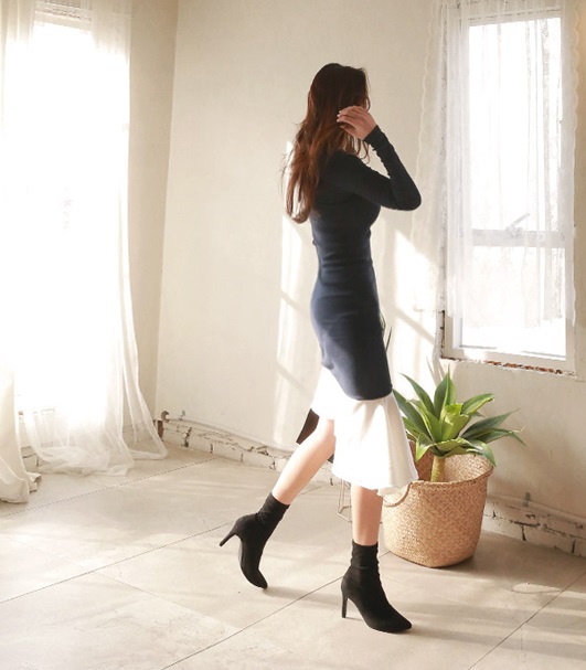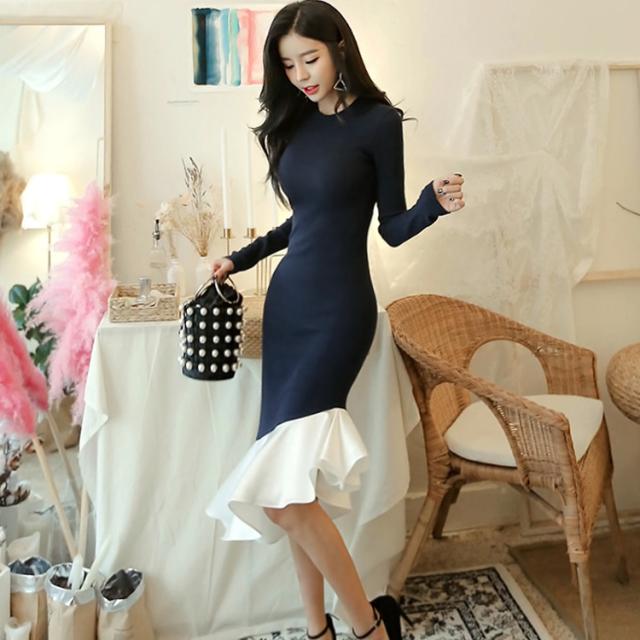 タイト Uネック 長袖 無地 ロング パーティースタイル ニットワンピース
