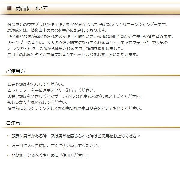 | 保湿成分のウマプラセンタエキスを10%も配合した、贅沢なノンシリコーンシャンプー。洗浄成分は、植物由来のものを中心に配合しております。香りは、大人の心強い味方になってくれる香りとしてアロマテラピーで人気のオレンジ・ビターの花から抽出されるネロリ精油を採用♪ |