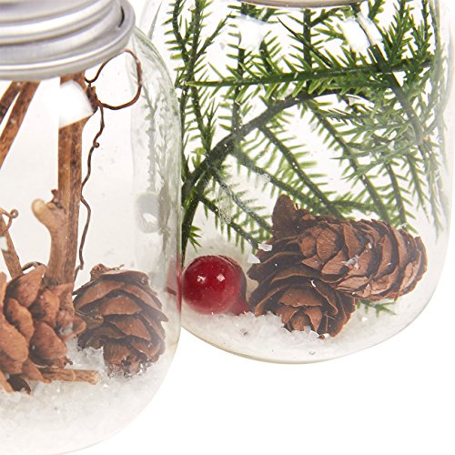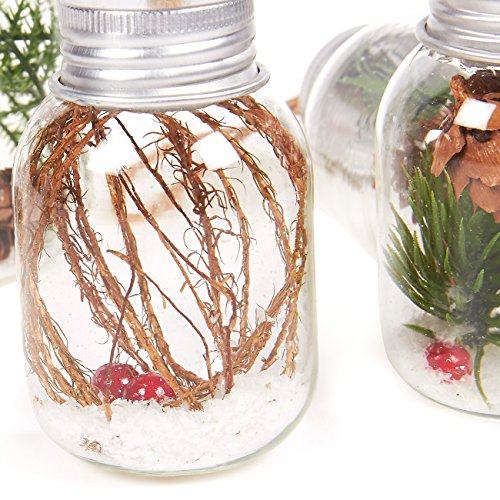 - SET INCLUDES: 6 hanging Christmas decorations featuring charming individual glass jars, containing an assortment of flora and fauna-style decorations, like acorns, pine leaves and more!
