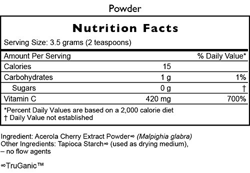 Truly NaturalTM Vitamin C is a 100% whole food, corn-free vitamin C from acerola cherry. Acerola cherries are one of the highest natural sources of vitamin C on the planet. Ascorbic acid never occurs as an isolate in Nature; instead, it exists within a whole food matrix with many other cofactors that assist with absorption. Acerola cherries are also high in B vitamins, carotenoids, bioflavonoids, and alkalizing minerals - specifically magnesium, potassium, iron, zinc, and calcium. Truly NaturalTM Vitamin C provides naturally-occurring, absorbable, non-toxic vitamin C. Contains no isolated ascorbic acid. Truly NaturalTM Vitamin C is vegan, kosher, and gluten-free. TruGanicTM Purity: Free of pesticides, GMOs, and irradiation; verified by actual testing. Lab tested for botanical identity, heavy metals, and microbiological activity. Available in powder. EcoFreshTM packaging delivers superior freshness. Manufactured in U.S. vegan facility free of gluten, peanuts, and tree nuts.