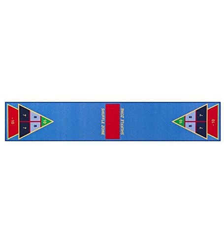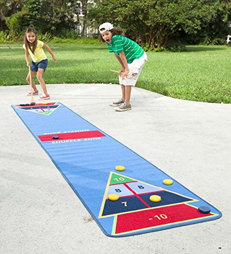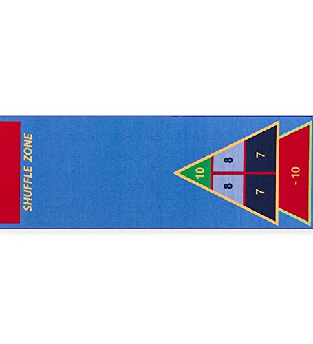 SHUFFLE ZONE PLAY CARPET, INDOOR OUTDOOR SHUFFLEBOARD GAME FOR KIDS, 2 WOODEN CUES, 10 WOODEN PUCKS, FUN STRATEGY GAME, 2.25'W X 12'L