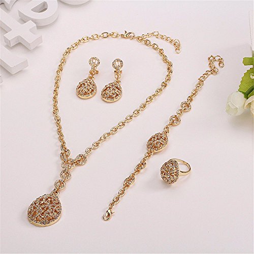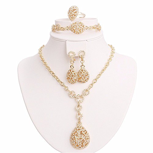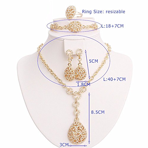 -. Feature : New Arrival Jewelry for Celebrition, Costume, Party, Wedding, Show / Jewelry Sets of necklace & bracelet & ring & one pair of earrings / 18K Gold plated is harmless and hypoallergenic for human / This jewelry set is shinning, beautiful, luxury looking and is suitable for many occasions, such as dinner party, birthday party and wedding. This set is an ideal gift for your girlfriend, fiancée, wife, mother or friend. It is also a good choice for engagement or wedding jewelry. / Size: As Picture