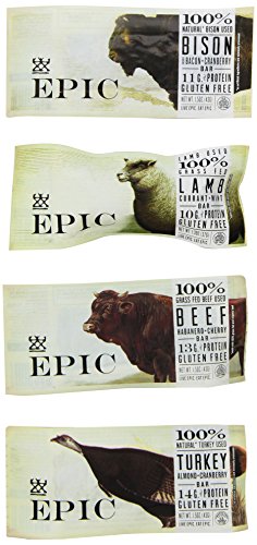 -. Feature : Epic Bar Sampler Pack- Bison, Turkey, Beef & Lamb (1 Bar of Each) / The Bison Bacon bar delivers a substantial serving of 100% grass fed and organic buffalo, brilliantly combined with humanely certified uncured bacon / The turkey bar is loaded with almonds, cranberries and tandoori spice to add both texture and balance to the dominant meatiness of the turkey / The Lamb Bar is comP.R.Ised of a select blend of 100% organic grass-fed lamb and sophisticated seasonings / We combined 100% organic grass fed beef with antioxidant-rich American grown cherries