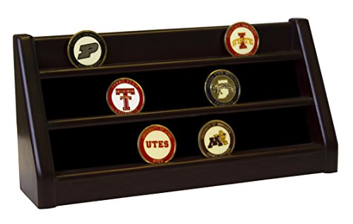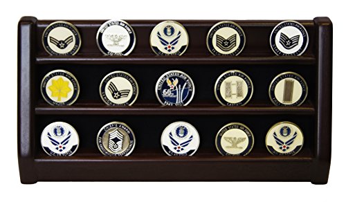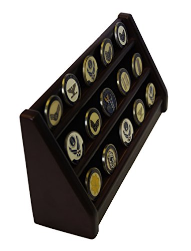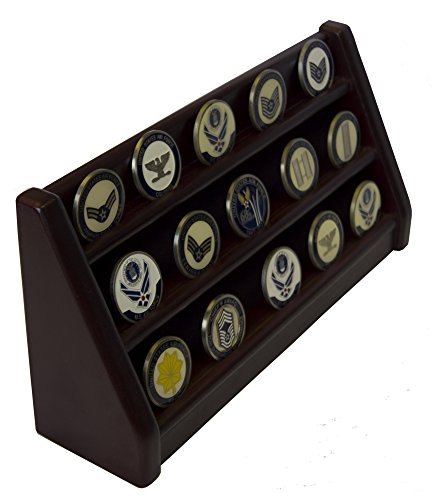 - Gorgeous Military Collectible 3 Rows Shelf Challenge Coin Holder Display Casino Chips Holder , Made from solid wood, Stained into Cherry Finish 13.5"W X 4.25"H X 2.5"D. You can display 30 Coins proudly all your treasured awards and memorabilia