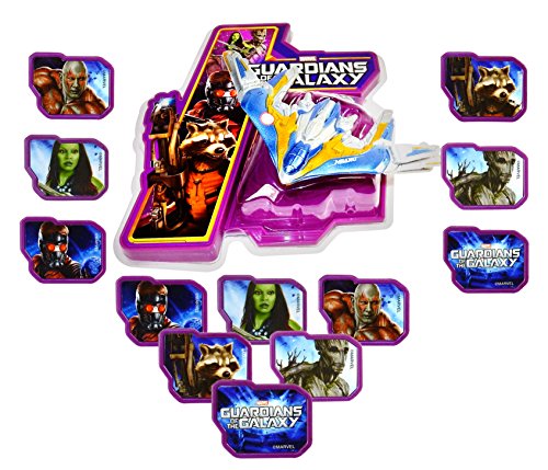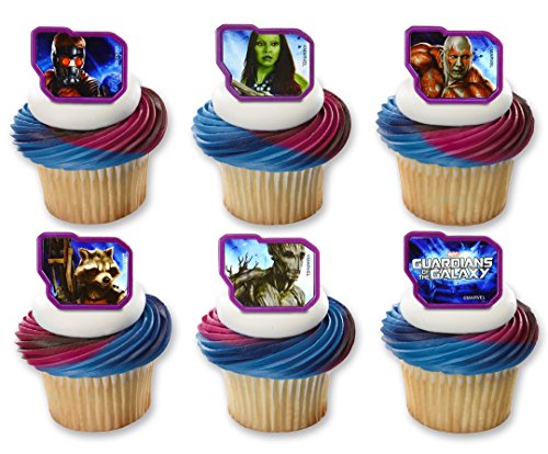 Studio : DecoPac Publisher : DecoPac Product Description Imagine the joy and excitement on your birthday child's face when you uncover their cake that features the Guardians of the Galaxy, a group of cosmic adventurers who protect the universe from threats all across space. Kit includes a dozen assorted cupcake rings featuring characters from the movie, and a colorful cake layon that supports a model toy action figurine of Peter Quill's starship Milano. When the party has ended and the cake is but a memory, your child can play with the action toy or keep this souvenir on his bedroom shelf to treasure for years to come. Made from sturdy plastic, these items are as rugged and tough as the kids they are intended for. When fully assembled, this Deco Set measures approximately 6"W x 5" L x 2 1/2"H. Ring tops measure approximately 1 1/2" across from side-to-side, the ring opening measures 5/8". Includes clear plastic liner trays to set in the cake frosting to keep both the Deco Set pieces and the cake clean. 0