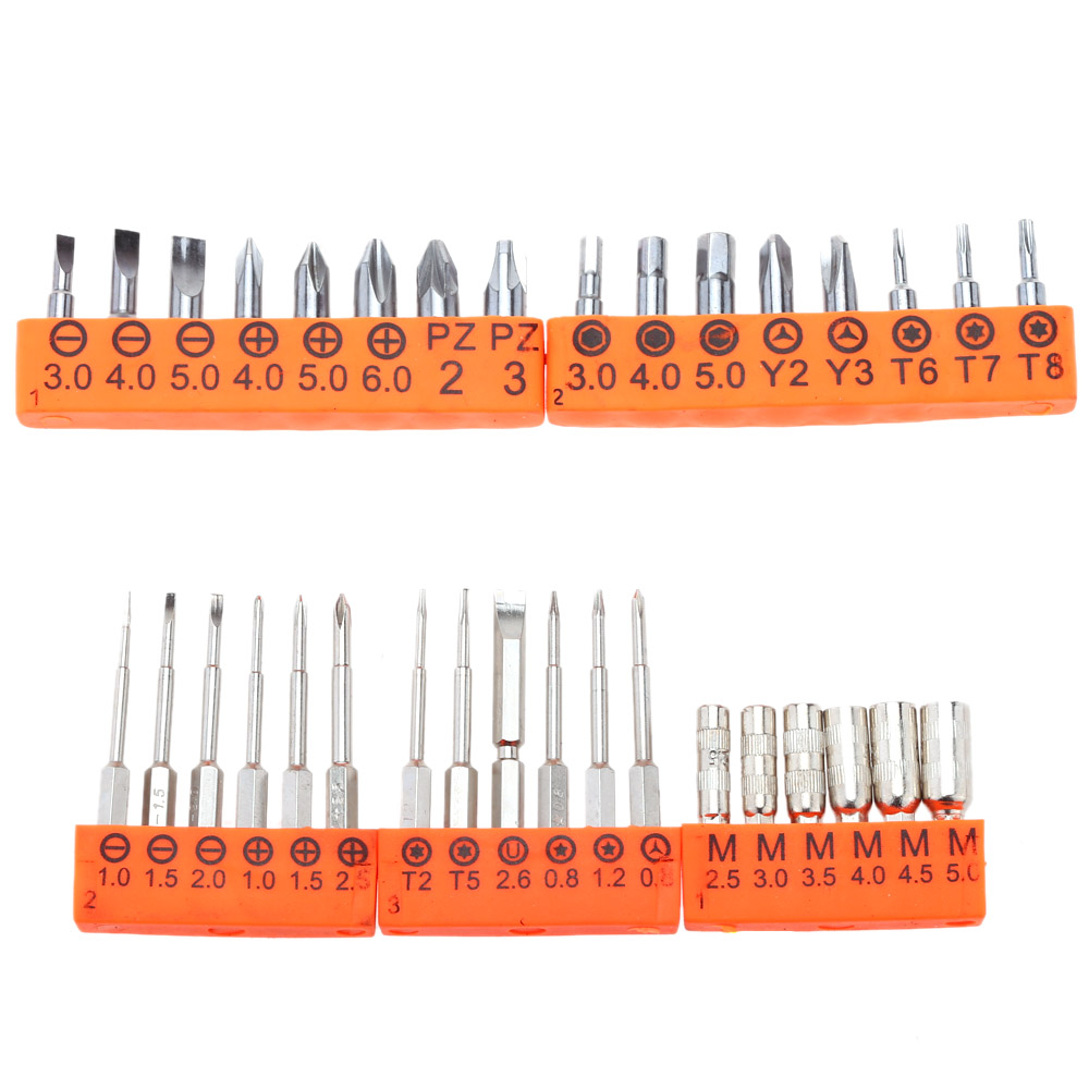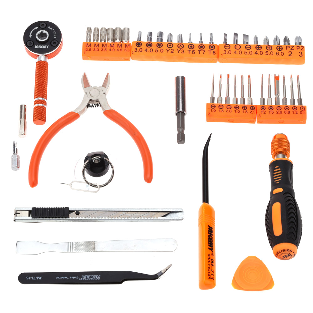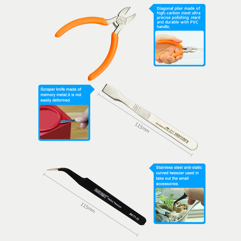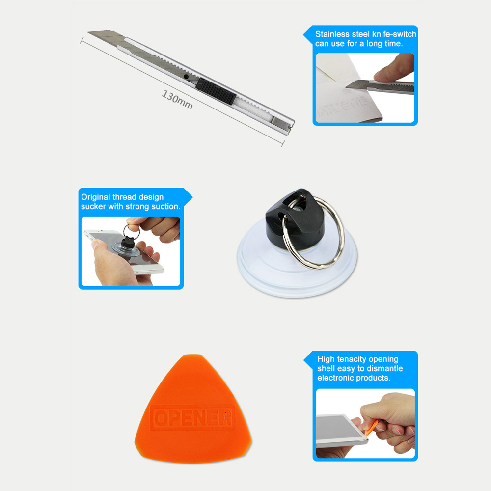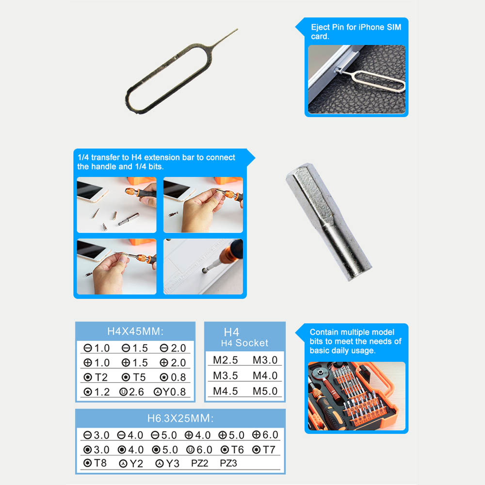 It has tweezer, pliers, utility knife, suction cup, scraper, SIM card eject pin, ratchet wrench and 30 types of screwdriver bits in one kit, which would meet your different needs.
