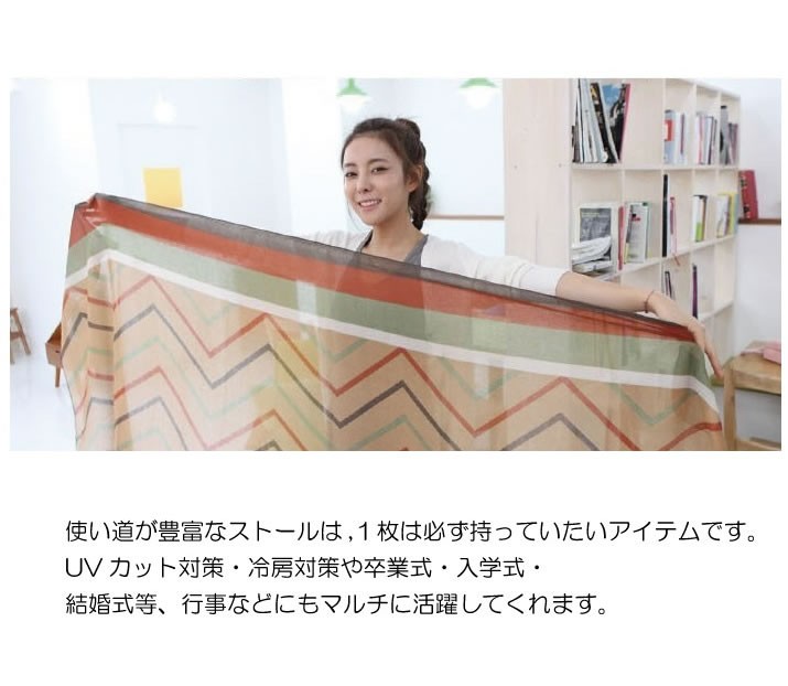 幾何学ストライプ柄のストール 通気性抜群 色合が素敵なロングストール