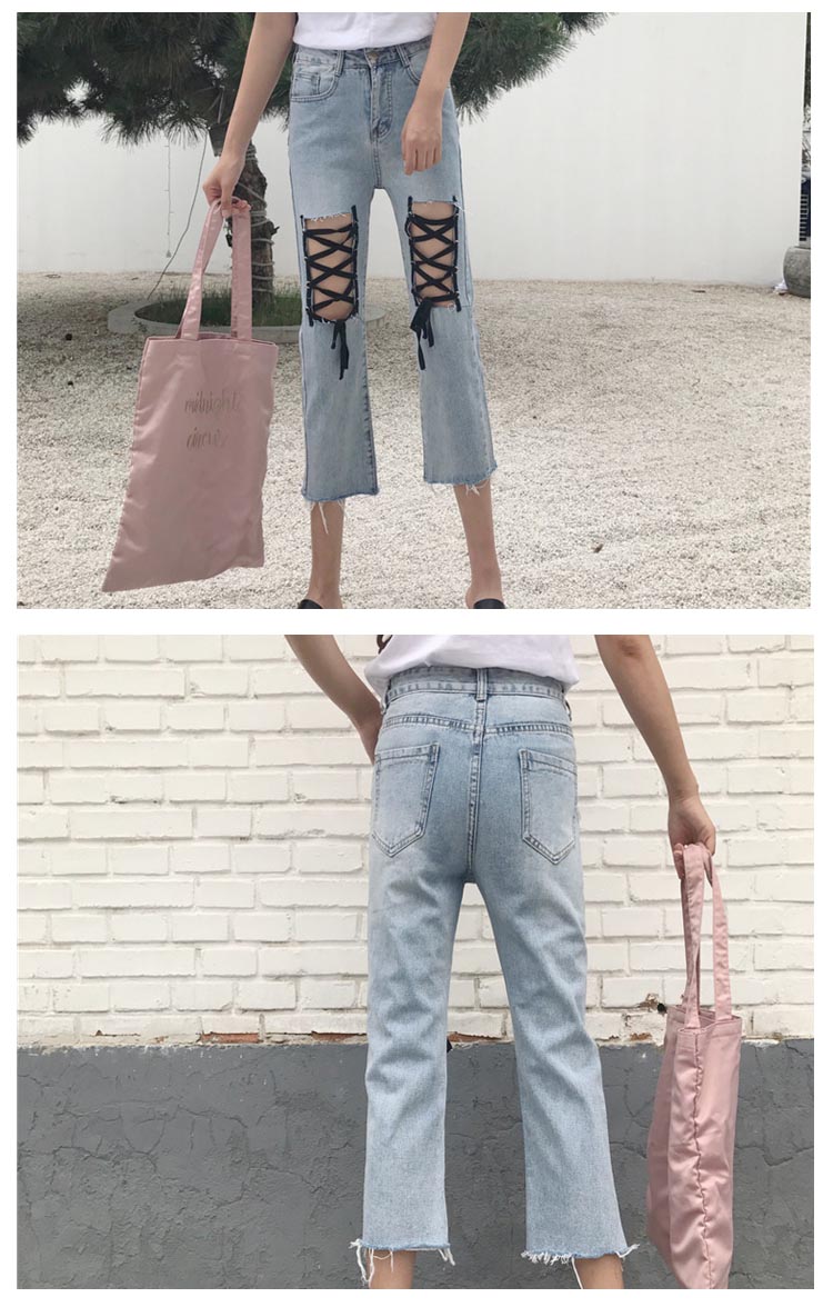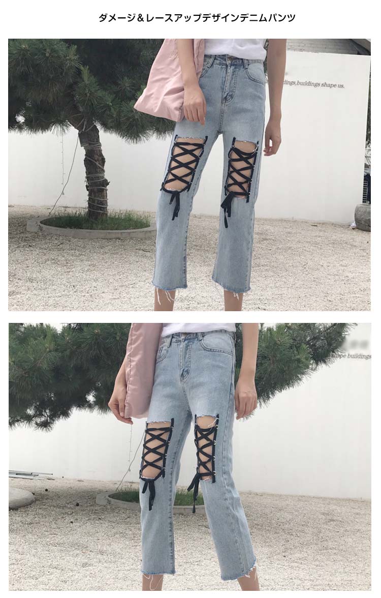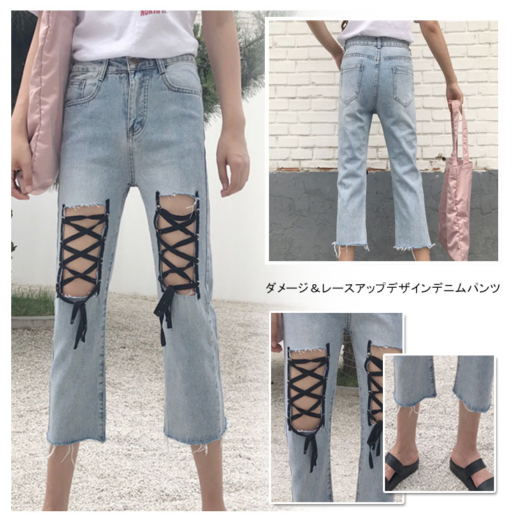 | ダメージ&レースアップデザインデニムパンツいつものデニムパンツが飽きた方にお勧めのスタイリッシュデニムパンツダメージ加工が風通し良い、暑い季節も着心地快適お手持ちのトップスとあわせて、クールなスタイリングが叶えます | |