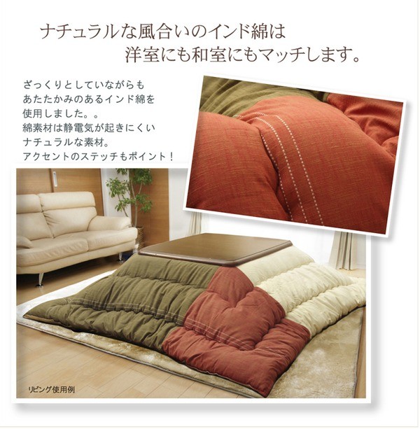 インド綿を使用したこたつ布団です。綿100%で静電気も起きにくくなっています。綿を起毛させることにより、ざっくり感を残したまま、肌触り和ら感商品に仕上げました。部分暖房のこたつは電気代もお得です