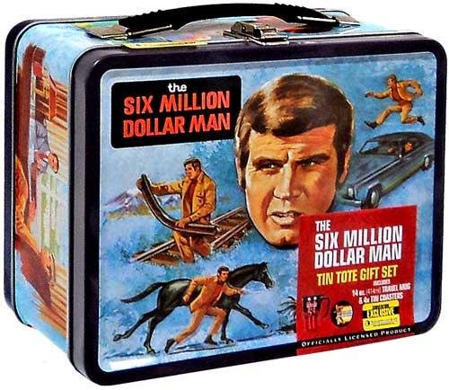 Remember this lunch box from the 1970s? Celebrate 40 years of The Six Million Dollar Man with this Six Million Dollar Man Tin Tote Gift Set that features an all-new, totally cheesy retro reproduction of the disco era's most bionic superhero on television! The artwork was painstakingly taken from a rusted old lunchbox, touched up, and accurately reproduced on this new 8 5/8-inch wide x 6 3/4-inch tall x 4-inch deep tin tote.