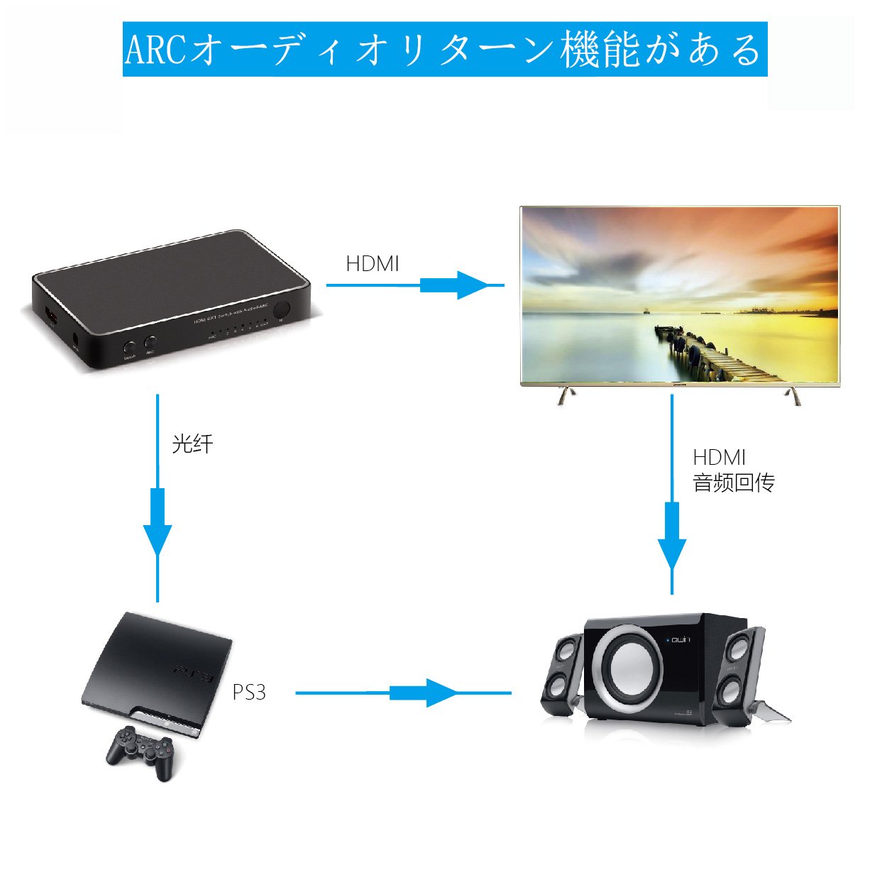 HEJSANG HDMI selector 6 input 1 output switch 6 selectors (6 ports) 4K × 2K / 1080P compatible optical fiber (coaxial) TosLink + SPDIF + ARC + 3.5mm audio output HDMI digital audio separator V1.4 HDMI audio separator for CEC / HDCP : HDMI to output: HDMI, SPDIF, RCA) Blu-ray / PS3 / Xbox / Camera / STB / PC / DVD Players / HD TV etc.
